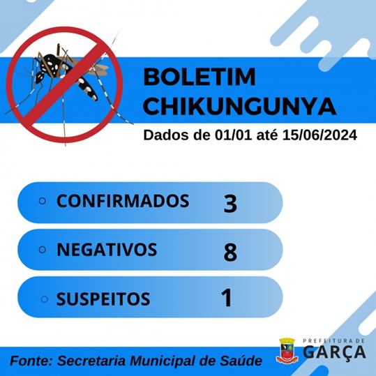 A Secretaria de Saúde divulgou ontem, dia 18, novo boletim com dados atualizados dos casos de Chikungunya em Garça. Os dados correspondem ao período de 01 de janeiro até o último dia 15 de junho e mostram que, no período foram confirmados três casos positivos de contaminação. No mesmo período foram negativados cinco casos e uma pessoa, considerada suspeita, aguarda os resultados dos exames realizados.