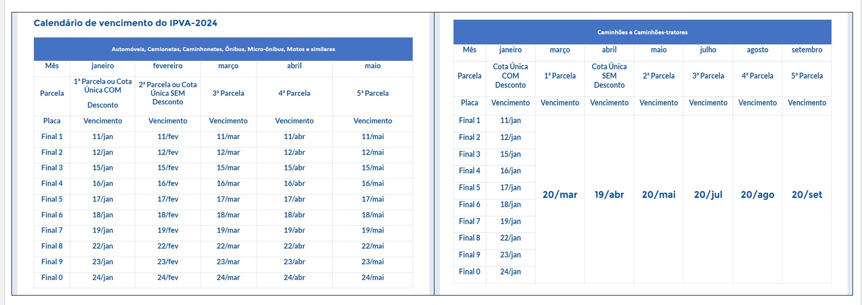 Os proprietários deverão observar o calendário de vencimento por final de placa do veículo. Para efetuar o pagamento do IPVA 2024, basta o contribuinte utilizar a rede bancária credenciada, com o número do RENAVAM (Registro Nacional de Veículo Automotor). É possível efetuar o recolhimento pela internet ou débito agendado, nos terminais de autoatendimento ou outros canais oferecidos pela instituição bancária. Também é possível realizar o pagamento em casas lotéricas e com cartão de crédito, nas empresas credenciadas à Secretaria da Fazenda e Planejamento.