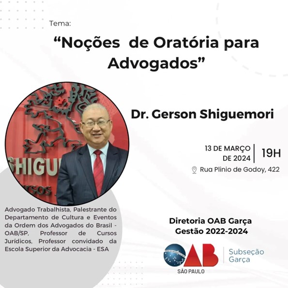 Amanhã, dia 13 de março, a Ordem dos Advogados do Brasil – 42.ª Subseção de Garça realiza a palestra “Noções de Oratória para Advogados”, a partir das 19 horas. O palestrante será o advogado trabalhista Gerson Shiguemori.