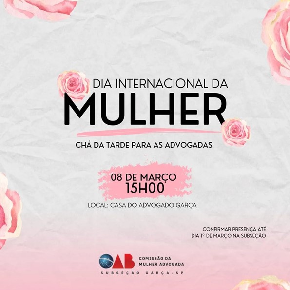 Hoje, dia 8 de março, Dia Internacional da Mulher, a 42.ª Subseção da Ordem dos Advogados do Brasil-OAB Garça realiza, a partir das 15 horas, um “Chá da Tarde para as Advogadas”.