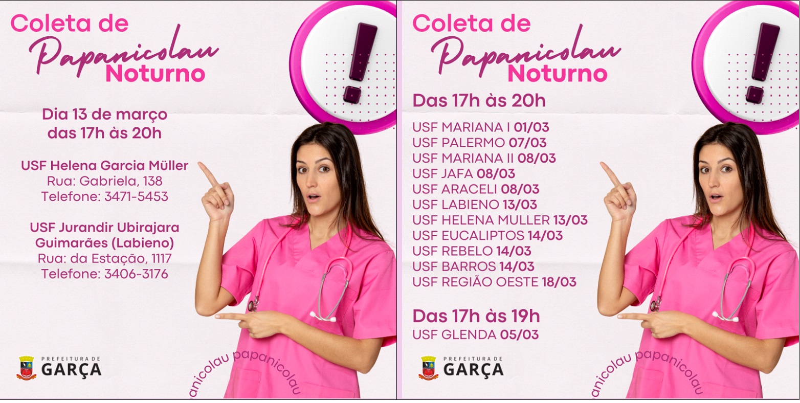 A Secretaria de Saúde de Garça promove no mês de março ações noturnas de coleta do exame Papanicolau. Amanhã, dia 13 de março, duas Unidade de Saúde da Família terão atendimento noturno, das 17h às 20h, para a coleta do Papanicolau. São elas: USF Jurandir Ubirajara Guimarães, conhecida como USF Labieno, que está localizada na rua da Estação, 1117; e USF Helena Garcia Müller, localizada na rua Gabriela, 138.