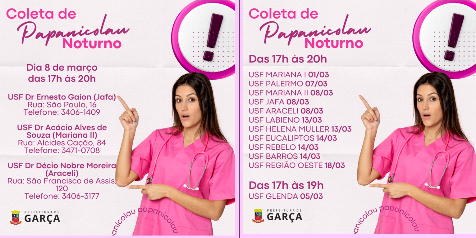 Hoje, sexta-feira, 8 de março, três Unidades de Saúde da Família terão atendimento noturno, das 17h às 20h, para a coleta do Papanicolau. São elas: USF Dr. Acácio Alves de Souza, conhecida como USF Mariana 2, que está localizada na rua Alcides Cação, 84; USF Dr. Ernesto Gaion, conhecida como USF Jafa, localizada na rua São Paulo, 16; e a USF Dr. Décio Nobre Moreira, conhecida como USF Araceli, localizada na rua São Francisco de Assis, 120.