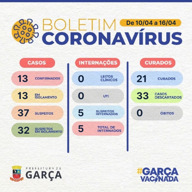 A Secretaria de Saúde de Garça divulgou ontem, dia 18 de abril, mais um boletim com dados atualizados de covid-19 na cidade. O dados divulgados correspondem ao período de 10 a 16 de abril e apontam a confirmação de 13 novos casos da doença. Trinta e sete pessoas estão classificadas como suspeitas e aguardam o resultado de exame e, entre os suspeitos, cinco estão internados. As internações apontam a gravidade dos casos visto que, segundo o divulgado, quatro estão em Unidade de Terapia Intensiva (UTI) e um em leito clínico (um internado em leito clínico na Santa Casa de Marília; um em leito UTI na Santa Casa de Marília; dois em leito UTI no Hospital Materno Infantil de Marília e um em leito UTI no Hospital São Lucas de Garça).