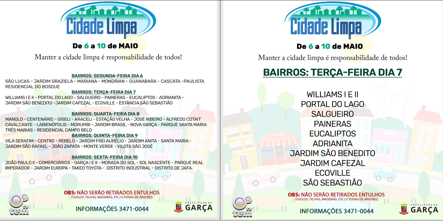 Com todas as atenções voltadas para o descarte consciente, começou ontem, dia 6 de maio em Garça, mais uma edição do Projeto Cidade Limpa. A iniciativa abrangerá todo o município com a coleta de materiais inservíveis descartados pela população. Hoje, dia 7 de maio, a ação percorrerá os bairros Williams I e II, Portal do Lago, Salgueiro, Paineiras, Eucaliptos, Adrianita, Jardim São Benedito, Jardim Cafezal, Ecoville e São Sebastião