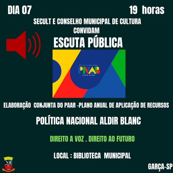 A Secretaria Municipal de Cultura de Garça-Secult e o Conselho Municipal da Cultura têm o prazer de convidar a população para um evento de suma importância para o desenvolvimento cultural de Garça: a "Escuta Pública". A ação acontece hoje, dia 7 de maio, a partir das 19 horas, na Biblioteca Municipal Doutor Rafael Paes de Barros. Todos são convidados a fazer parte da elaboração conjunta do Plano Anual de Aplicações de Recursos (PAAR).