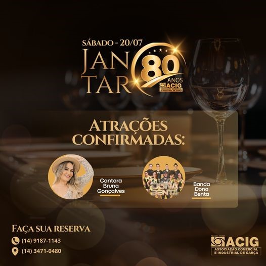 “Venha celebrar conosco um marco de 80 anos de história e sucesso da Associação Comercial de Garça! Conheça nossas atrações confirmadas. Reserve seu lugar agora para o jantar especial que estamos preparando. Uma noite de memórias, reconhecimento e conexões que não pode perder. Save the date: 20/07”.