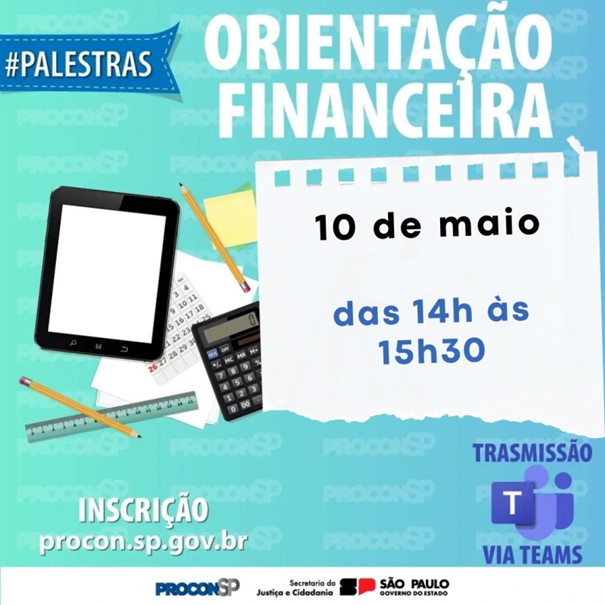 O PROCON SP- Órgão de Defesa do Consumidor realizará no dia 10 de maio, quinta-feira, das 14h às 15h30 10h, a palestra “Orientação Financeira”, as inscrições devem ser realizadas até o dia 9 de maio, às 23h59 por meio do link https://www.procon.sp.gov.br/epdc/#epdc_inscricoesabertas.