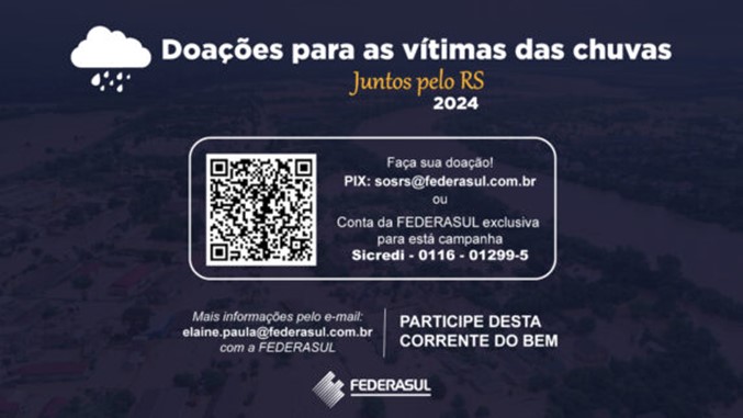 As doações podem ser feitas por PIX: sosrs@federasul.com.br ou através de depósito em conta da Federasul aberta exclusivamente para a campanha no Sicred: 011601229-5