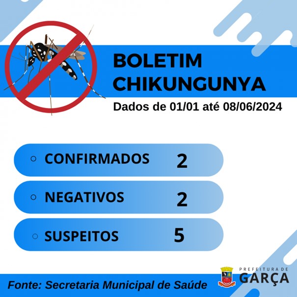 Na tarde de ontem, 10, a Secretaria de Saúde em Garça divulgou o primeiro boletim relativo a transmissão da Chikungunya na cidade. A doença, que já estava em circulação em cidades da região, foi registrada no município, com a confirmação de dois casos positivos. Cinco pessoas aguardam resultado dos exames e figuram como suspeitas. Dois casos foram negativados.