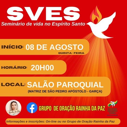 “Vem aí mais um SVES (Seminário De Vida No Espírito Santo) e saiba que o Fogo do Espírito Santo vai incendiar e transformar a sua vida! Prepare seu coração e garanta a sua inscrição!”, convida a Paróquia através das redes sociais.