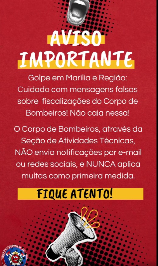 “Golpe em Marília e Região: Cuidado com mensagens falsas sobre fiscalizações do Corpo de Bombeiros! Não caia nessa! O Corpo de Bombeiros, através da Seção de Atividades Técnicas, não envia notificações por e-mail ou redes sociais, e nunca aplica multas como primeira medida. Fique atento”, divulgou o 10ºGB nas redes sociais.