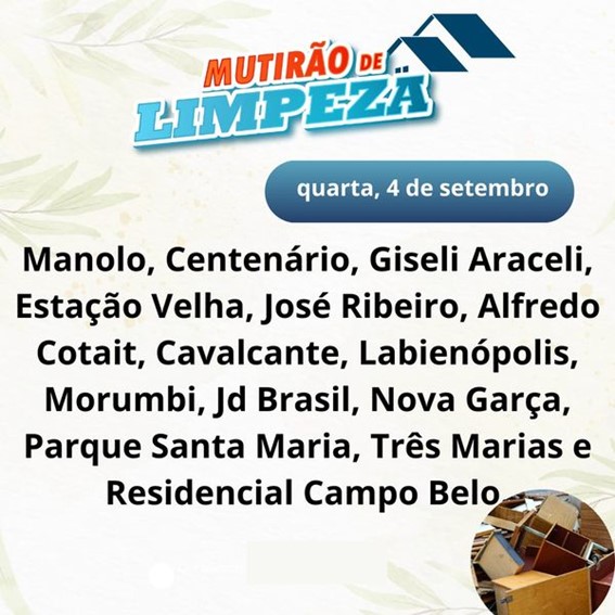 Mutirão de Limpeza: hoje trabalho acontece nos bairros Manolo, Centenário, Giseli, Araceli, Estação Velha, José Ribeiro, Alfredo Cotait, Cavalcante, Labienópolis, Morumbi, Jardim Brasil, Nova Garça, Parque Santa Maria, Três Marias, Residencial Campo Belo