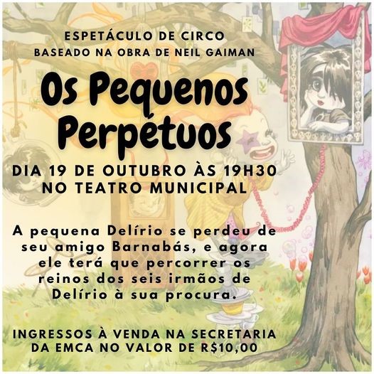 No próximo sábado, dia 19 de outubro, a partir das 19h30, as cortinas da Sala Miguel Mônico vão se abrir para receber o espetáculo “Os Pequenos Perpétuos” . A peça é trazida pela Escola Municipal de Cultura Artística (EMCA) que promete transformar o palco do Teatro Municipal Sala Miguel Mônico em um mundo de maravilhas circenses.
