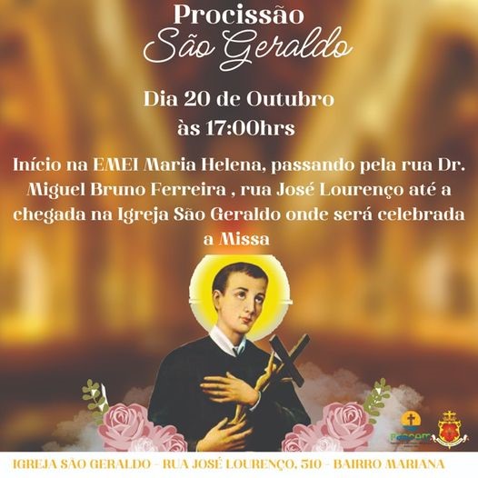 A Paróquia de São Pedro Apóstolo em Garça realiza no próximo domingo, dia 20 de outubro, a partir das 17 horas, a procissão em honra a São Geraldo. Conforme divulgado, a procissão partirá da EMEI Maria Helena até a Igreja São Geraldo. Ao final da procissão, será celebrada a Santa Missa, em homenagem ao santo.
