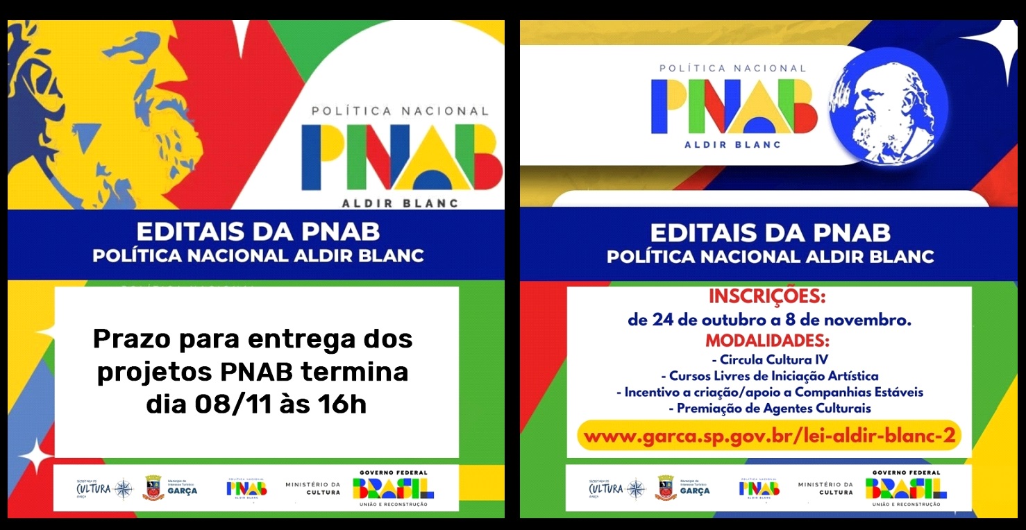 Termina às 16 horas de hoje, dia 8 de novembro, o prazo para a entrega de projetos para o PNAB. Conforme comunicado da Secretaria Municipal de Cultura de Garça-Secult, os interessados devem apresentar um envelope lacrado com os documentos exigidos no edital, que incluem comprovantes da atuação cultural e, no caso de coletivos, a declaração de representação no Departamento de Contratos e Licitações