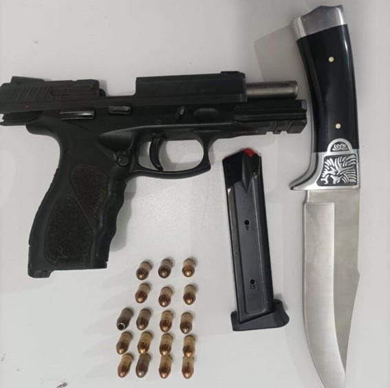 A Polícia Militar de Garça prendeu um homem acusado de manter a companheira sob ameaças por horas, na madrugada de sábado (23). Segundo o relato da vítima, ela foi ameaçada desde o período da noite de sexta (22), enquanto o agressor passava a faca em seu rosto e dizia que iria atirar contra sua cabeça. Por volta das 5h, a Polícia Militar recebeu uma chamada de socorro pelo número 190. Uma equipe foi imediatamente deslocada para o local e, ao chegarem, os policiais encontraram a vítima já se aproximando da viatura, visivelmente abalada. A mulher entregou aos agentes a faca usada pelo agressor e informou que ele tinha também uma arma de fogo. Ela teria se aproveitado que o homem dormiu para acionar a viatura. Os militares entraram na casa encontraram o acusado deitado no sofá. Durante a busca, localizaram uma pistola calibre 380 sobre o guarda-roupas, carregada com 18 munições. O agressor admitiu que havia discutido com a vítima por ciúmes, mas negou as ameaças. O caso foi encaminhado à Central de Polícia Judiciária (CPJ) de Marília, onde o homem teve a prisão mantida e a arma foi apreendida. (Foto Divulgação PM)