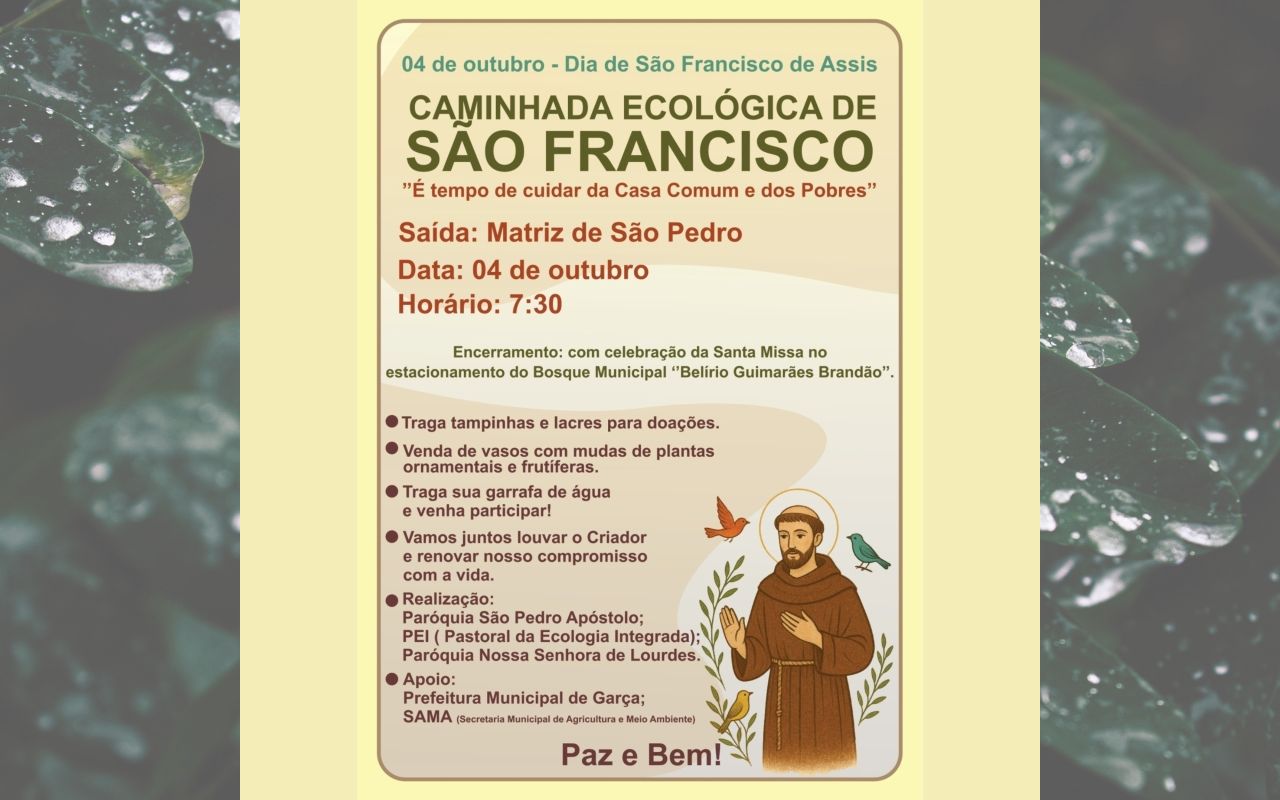 No próximo sábado, dia 04 de outubro, Dia de São Francisco de Assis, a cidade de Garça terá uma programação especial organizada pela Pastoral da Ecologia Integrada (PEI) da Paróquia São Pedro Apóstolo, com a participação de fiéis da Paróquia Santuário de Nossa Senhora de Lourdes. O evento conta com o apoio da Prefeitura Municipal de Garça, por meio da Secretaria Municipal de Agricultura e Meio Ambiente (SAMA).