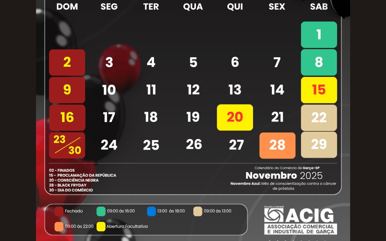 A ACIG informa aos empresários ligados ao comércio que, neste mês de novembro, há dois feriados com impactos diretos sobre o funcionamento dos estabelecimentos: o de 15 de novembro (Dia da Proclamação da República), que cai em sábado, e o de 20 de novembro (Dia da Consciência Negra), na quinta-feira.