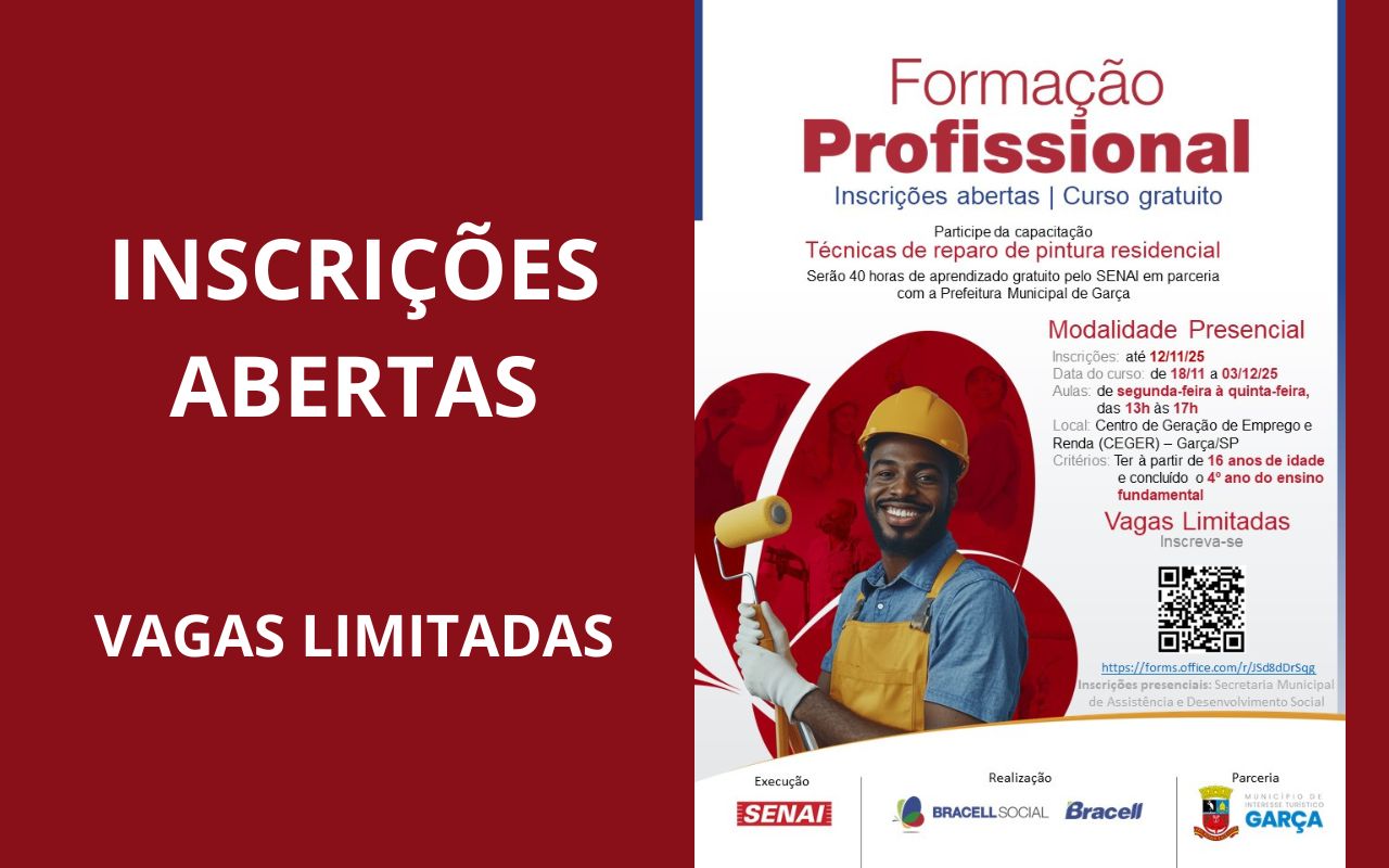 A Bracell, em parceria com a SENAI e a Prefeitura Municipal de Garça, está oferecendo o curso gratuito Técnicas de Reparos em Pintura Residencial, voltado para capacitar moradores da cidade em atividades de manutenção e pintura doméstica. As inscrições estão abertas até dia 12 deste mês, pelo link https://forms.office.com/r/JSd8dDrSqg . As vagas são limitadas.