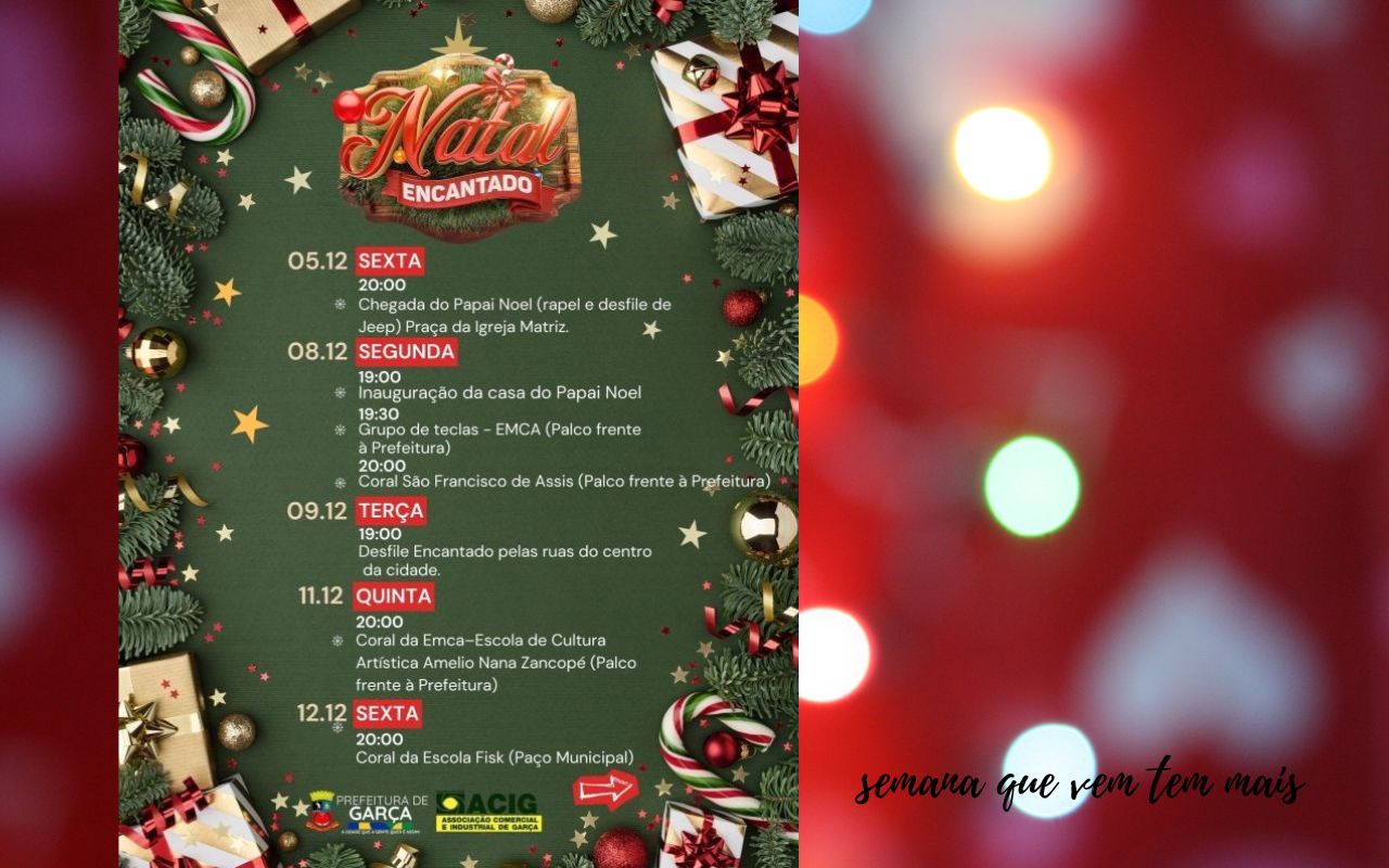 A Prefeitura convida toda a população a participar das atividades e aproveitar o período festivo com cultura, lazer e espírito natalino.