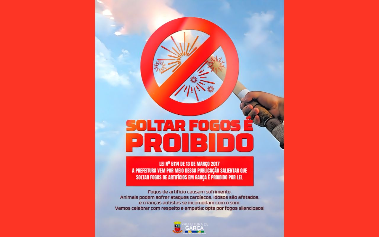 A Prefeitura Municipal de Garça reforça à população que é proibido soltar fogos de artifício no município, conforme estabelecido pela Lei Municipal nº 5.114, de 13 de março de 2017. A legislação proíbe a queima, soltura e comercialização de fogos de artifício com estampido em todo o território garcense.